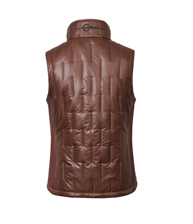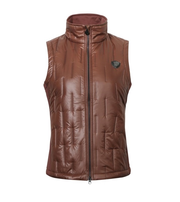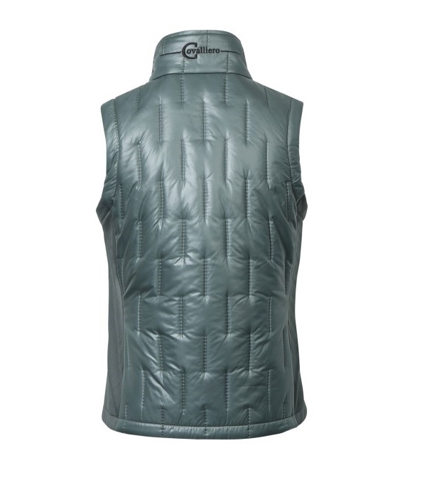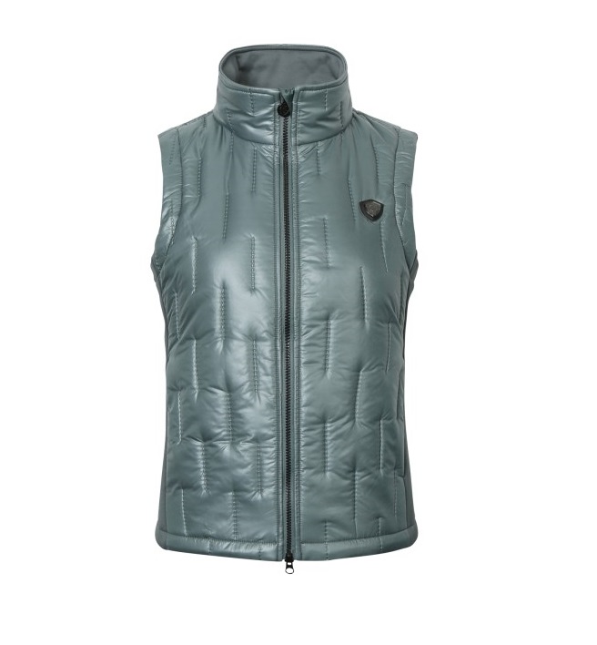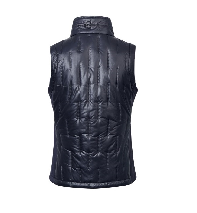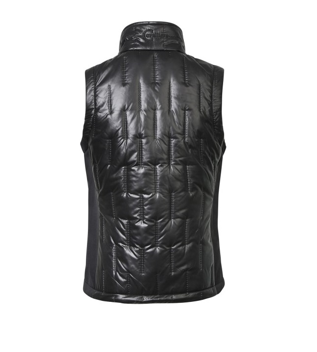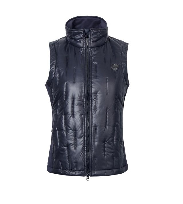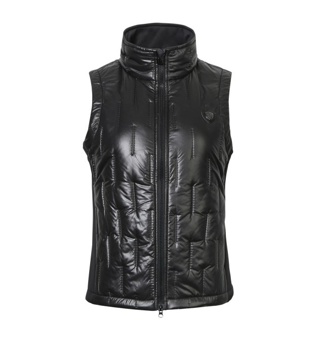 Женский жилет из комбинированной эластичной микрофибры и стеганного полиэстра. Женственный, приталенный крой. Два передних кармана для рук на молнии и воротник-стойка. Состав: верхняя ткань - 100% полиэстер, боковые вставки микрофибра - 95% полиэстер, 5% эластан. Машинная стирка при 30 градусах.